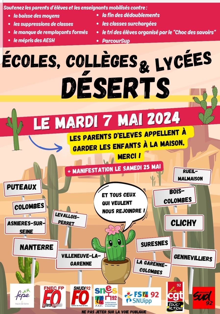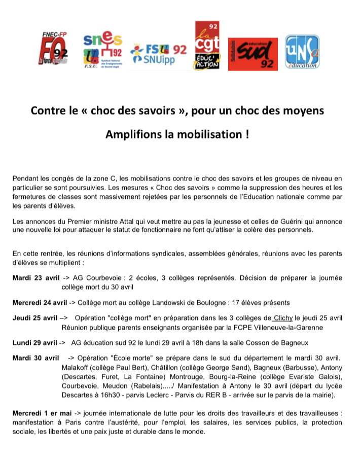 - Forte mobilisation le 7 mai dans le nord 92 contre le choc des savoirs : écoles, collèges et lycées déserts dans le nord du département, à l’appel des fédérations de parents d’élèves ; Les enseignants mobilisés à leur côtés !
