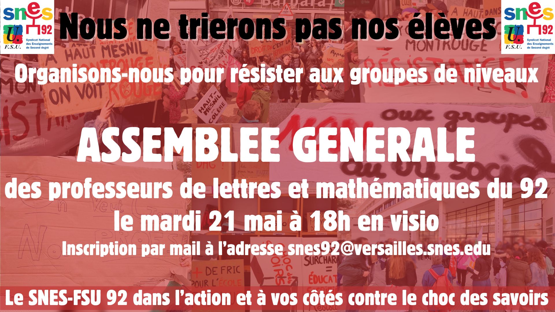 Afin de permettre aux professeurs de lettres et de mathématiques d’échanger et de se coordonner sur la meilleure façon de porter le refus de la profession de cette réforme lors de ces réunions, la section départementale SNES-FSU 92 vous propose une AG des professeurs de lettres et de mathématiques du département le mardi 21 mai à 18h en visio.