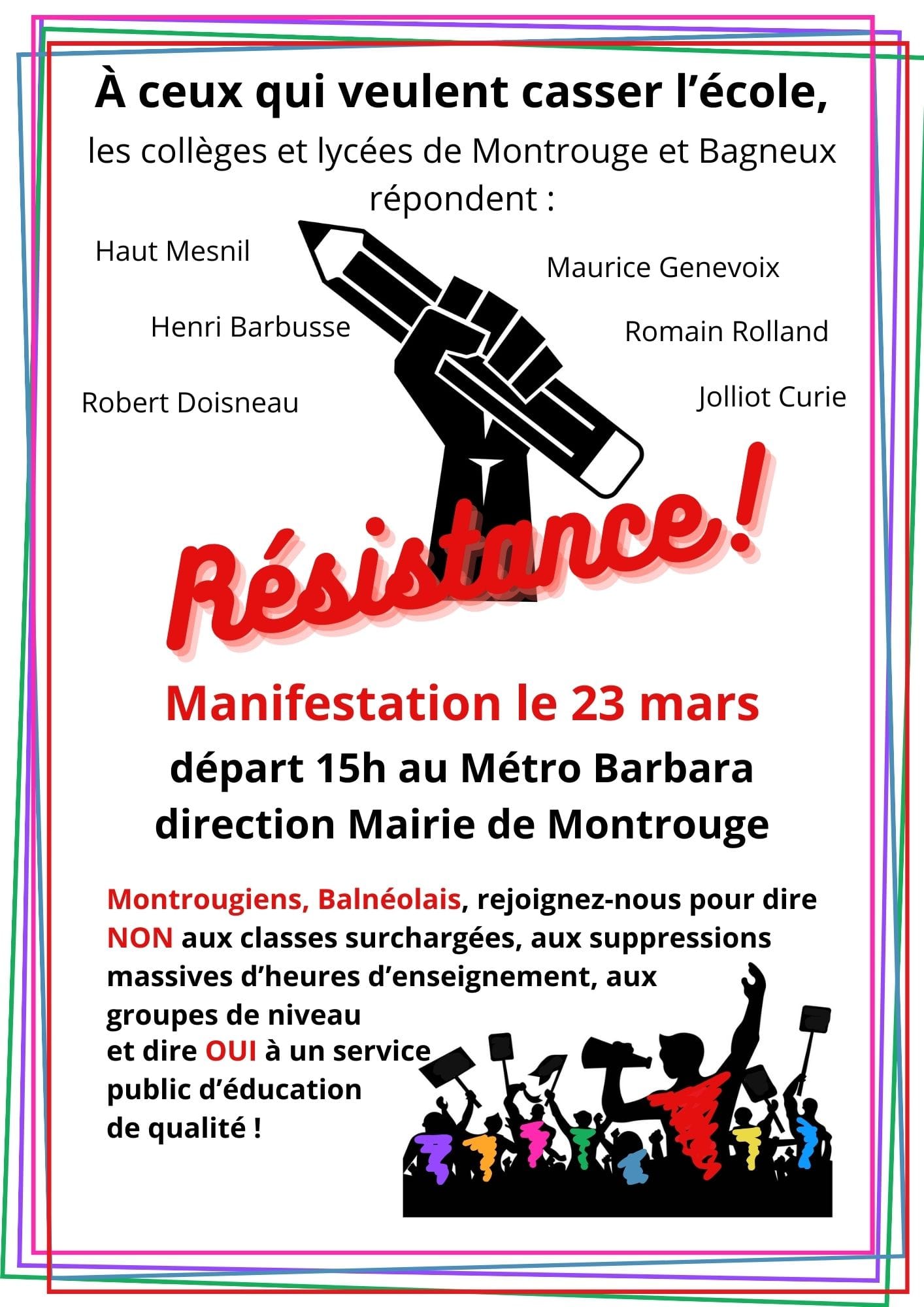 - Contre le choc des savoirs et les baisses de DHG, succès de la manifestation des établissements de Montrouge et Bagneux samedi 23 mars !