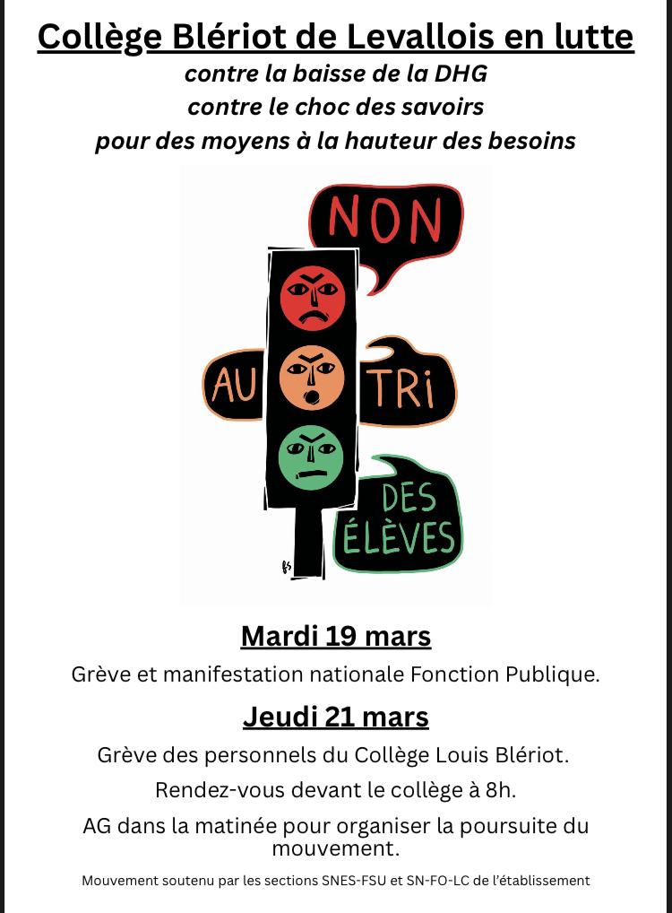 - Après la grève du 19, opération « collège mort » à l’appel des parents le 20 et grève reconduite le jeudi 21 mars : 80% de grévistes au collège Blériot de Levallois contre le choc des savoirs et la baisse de sa DHG !