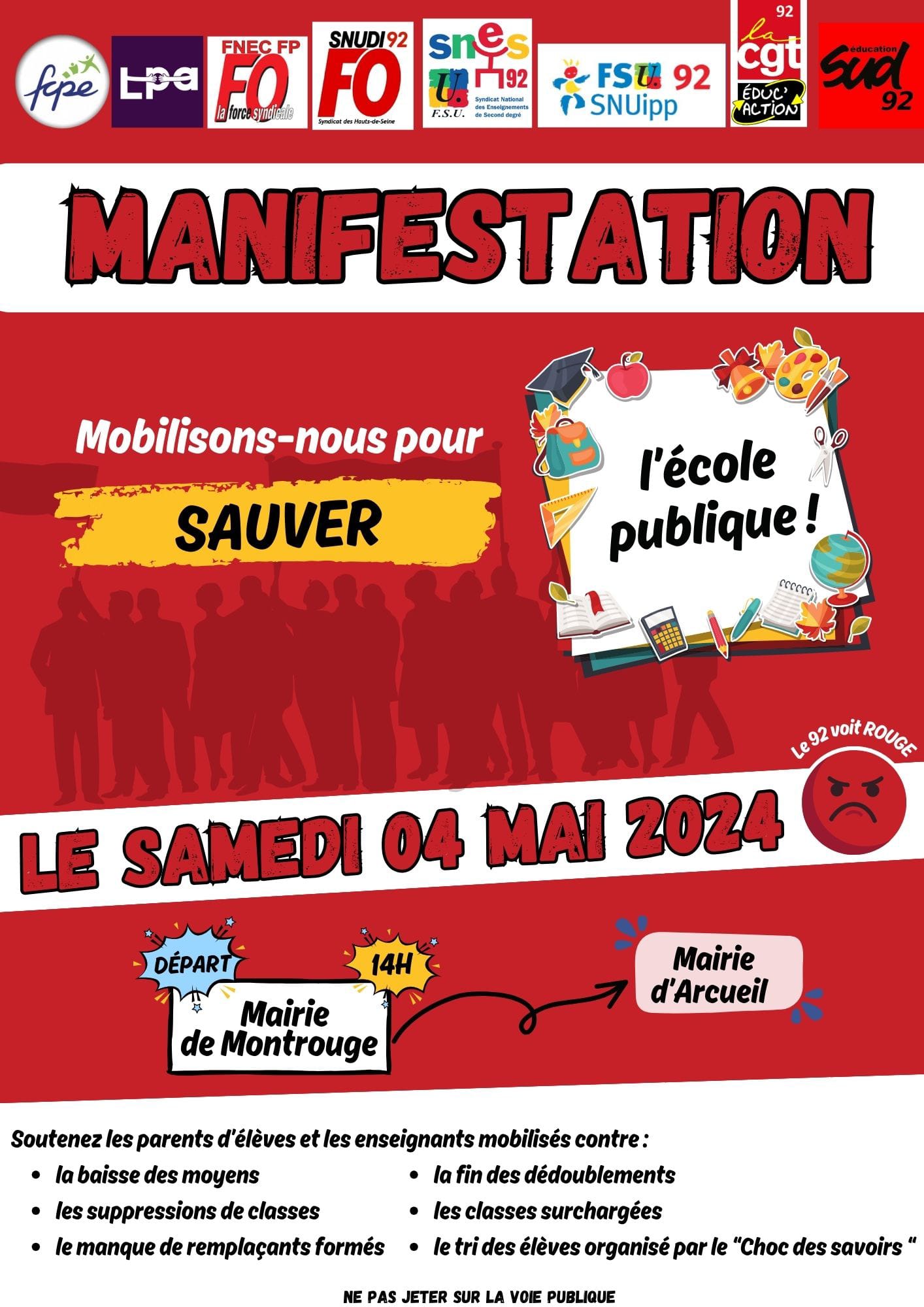 - Le 4 mai : les parents et personnels des établissements mobilisés du sud du département organisent une manifestation au départ de la mairie de Montrouge à 14h. Le SNES-FSU 92 appelle les personnels à se joindre massivement à cette manifestation